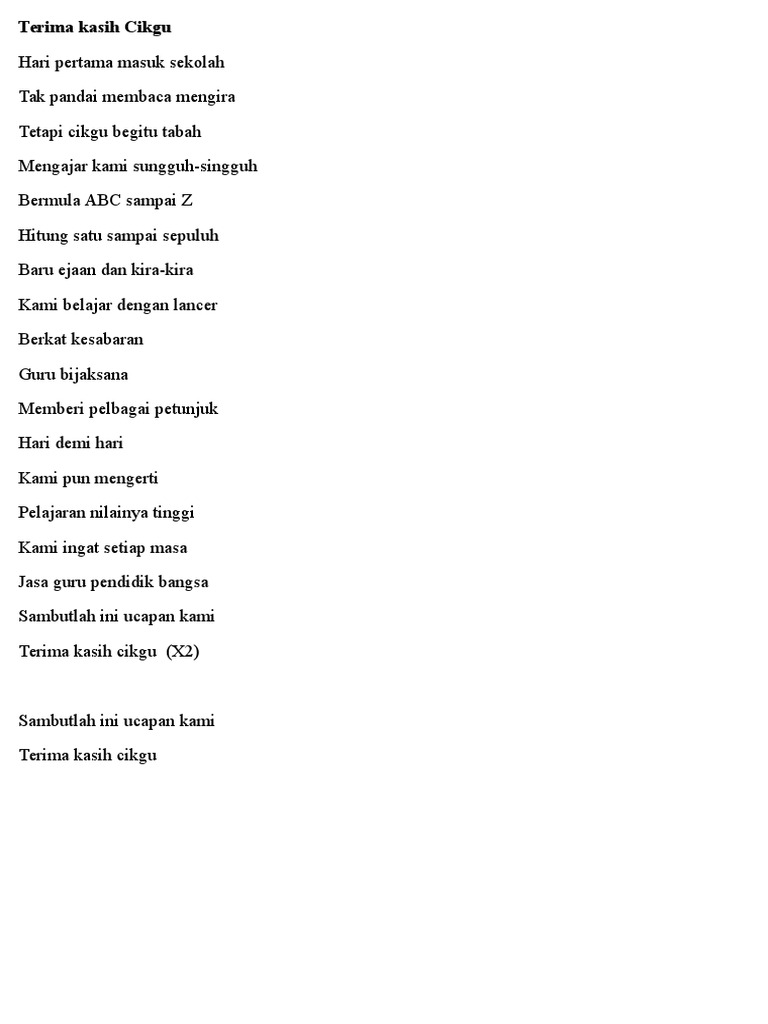 Hingga aku besar kan ku ingat selalu. Terima kasuh ku kepada mu cikgu. Download Lirik Lagu Terima Kasih Cikgu.