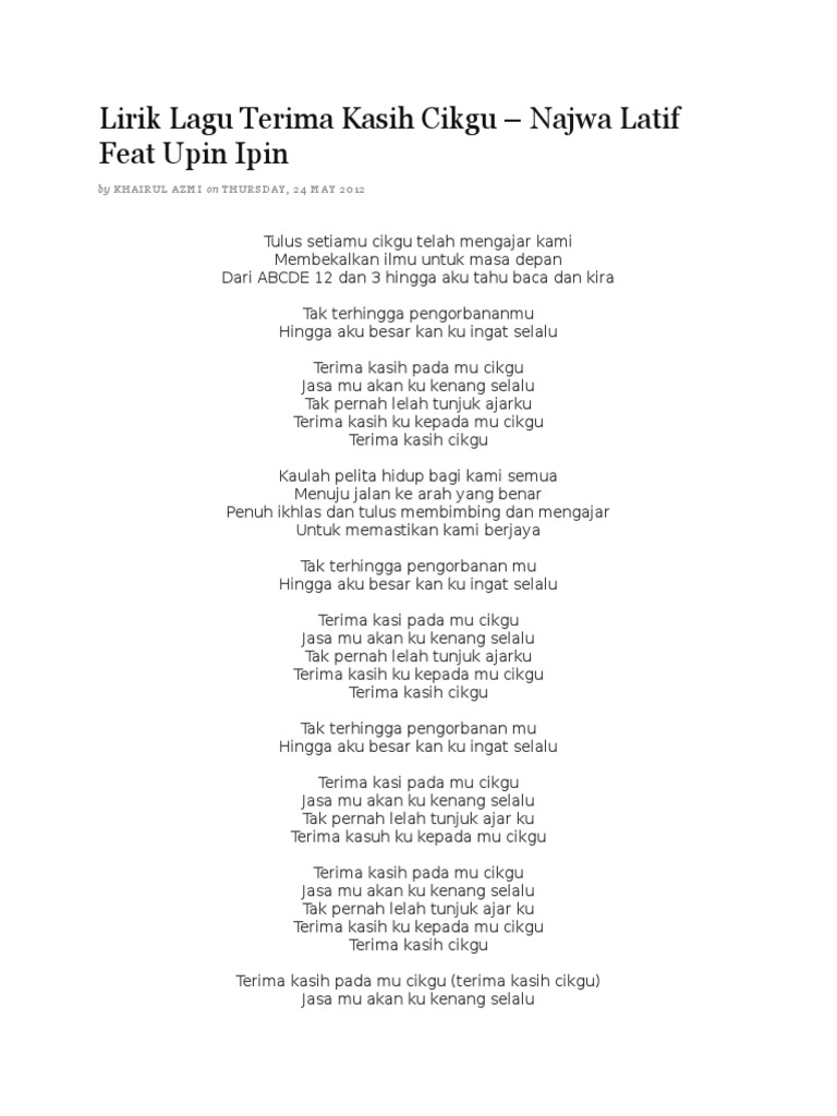 The lirik-terima-kasih-cikgu-najwa-latif have 2012-05-25 120303 and 1935547. Lirik Lagu Terima kasih Awie. O Scribd é o maior site social de leitura e publicação do mundo.